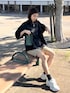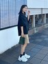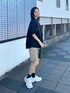 ハーフパンツコーデ ブラウス合わせで大人っぽく♩ キーネックだから首元すっきりで 袖の形も可愛い♡ 靴はお気に入りNew balance90/60👟