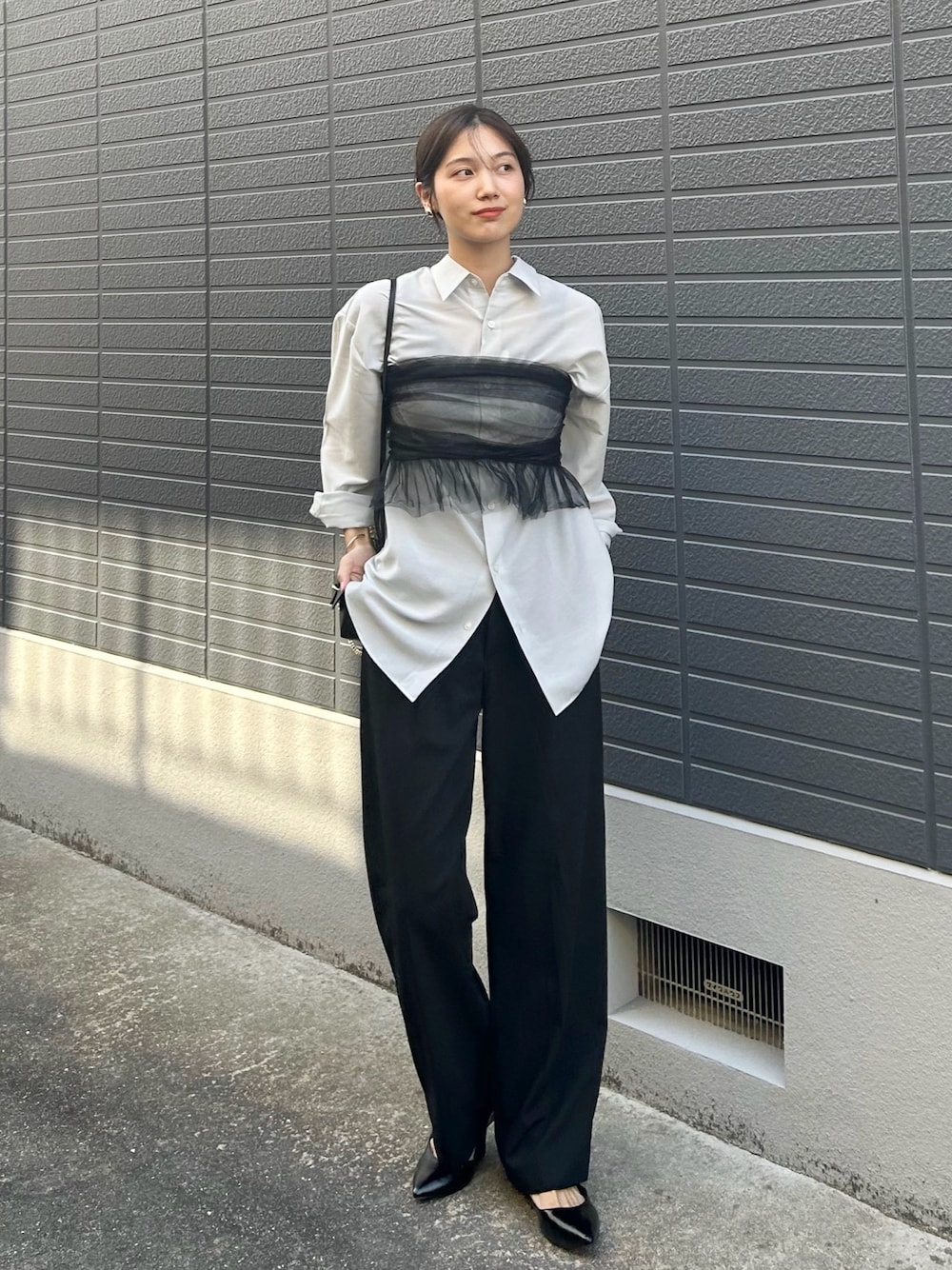 チュールビスチェをシャツに重ねて、 いつものコーデを新鮮に♻️ まえがみ、、🌬️