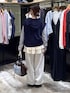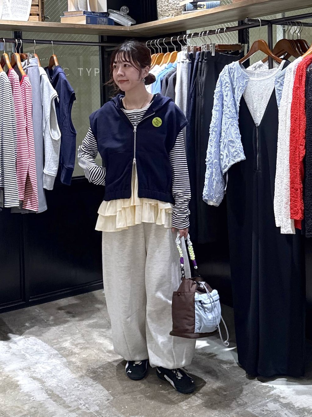 トレンドコーデ★ カジュアルなベストと、スウェットパンツを フリルとピッタリ目のインナーでガーリーに🩷!