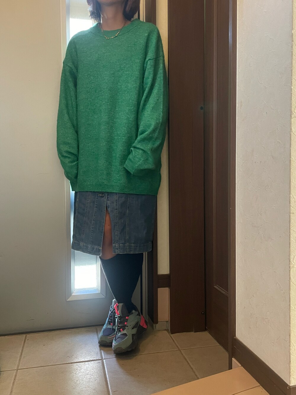 グリーンニット再び。 中はデニムワンピ。 こんにちは。
