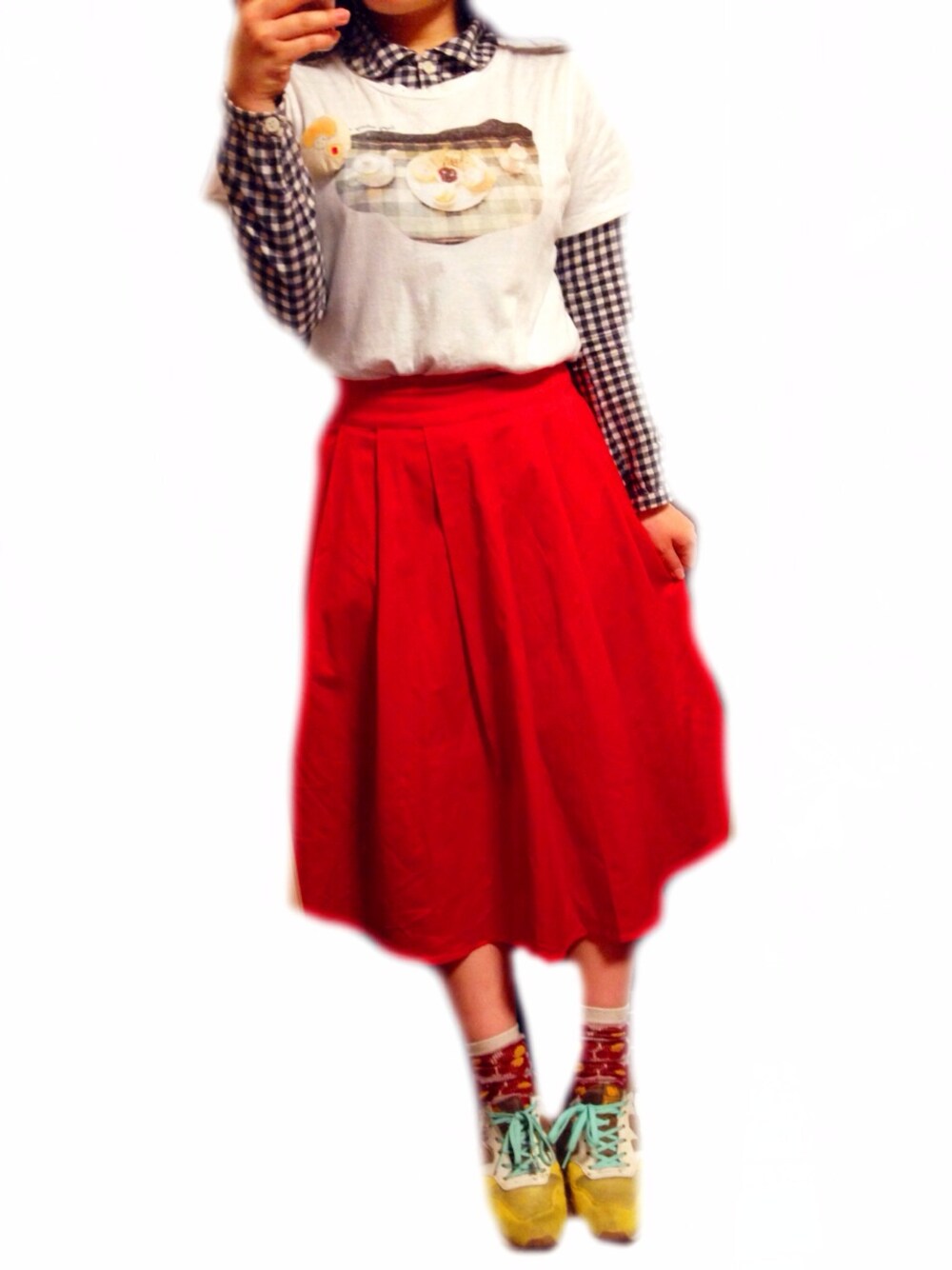 2014.05.01 ⚑ 赤スカートが主役のコーデ ◎ ハンドメイドのブローチがお気に入り !