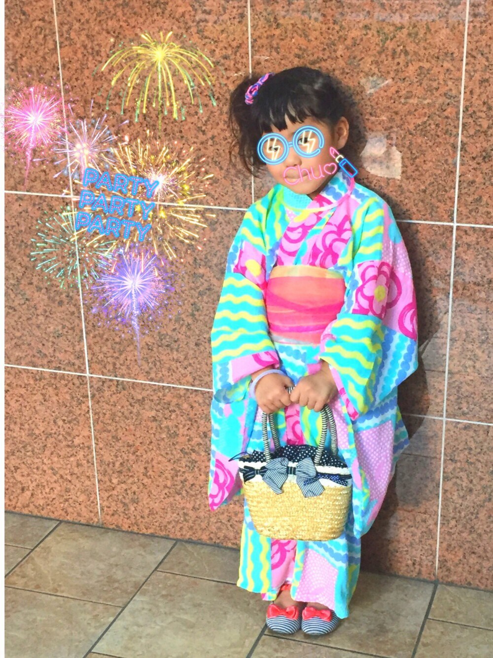 近所の盆踊りへ〜*\(^o^)/* 夏は浴衣!! 夜なべして裾上げした浴衣を着てね〜♪草履は履きなれないので足元だけ洋装っっっ 浴衣風も可愛いけど、やっぱり王道の浴衣を帯できて欲しい母の昭和心!笑