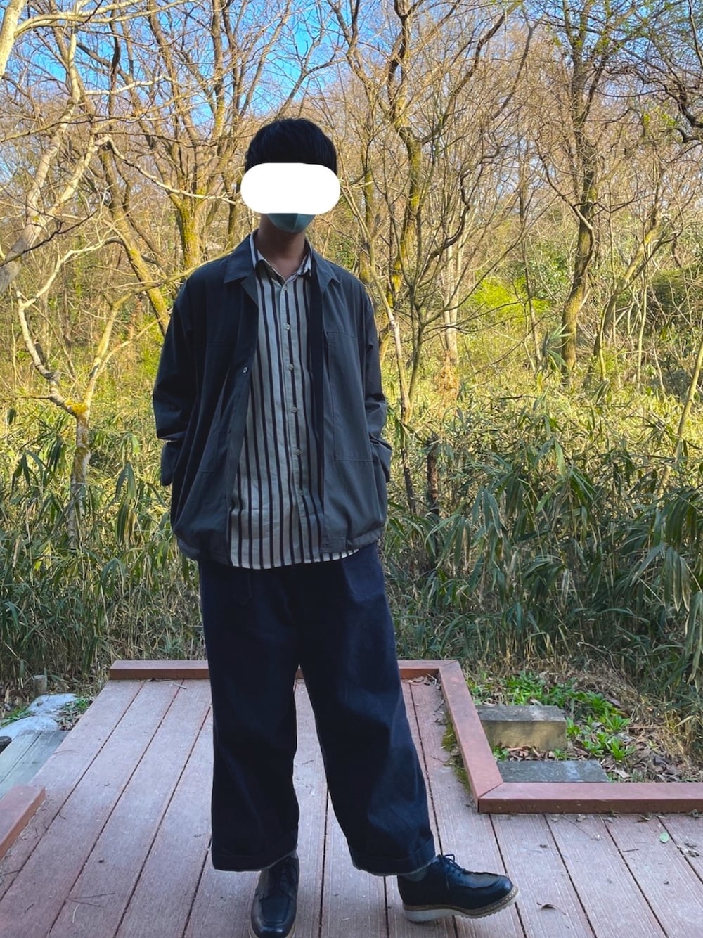 UNIQLO +Jのスーピマコットンオーバーサイズシャツブルゾン(オリーブ)をさっそく着ました Graphpaperのお気に入りのベルテッドパンツがWEARにないの悲しい またこれは森です
