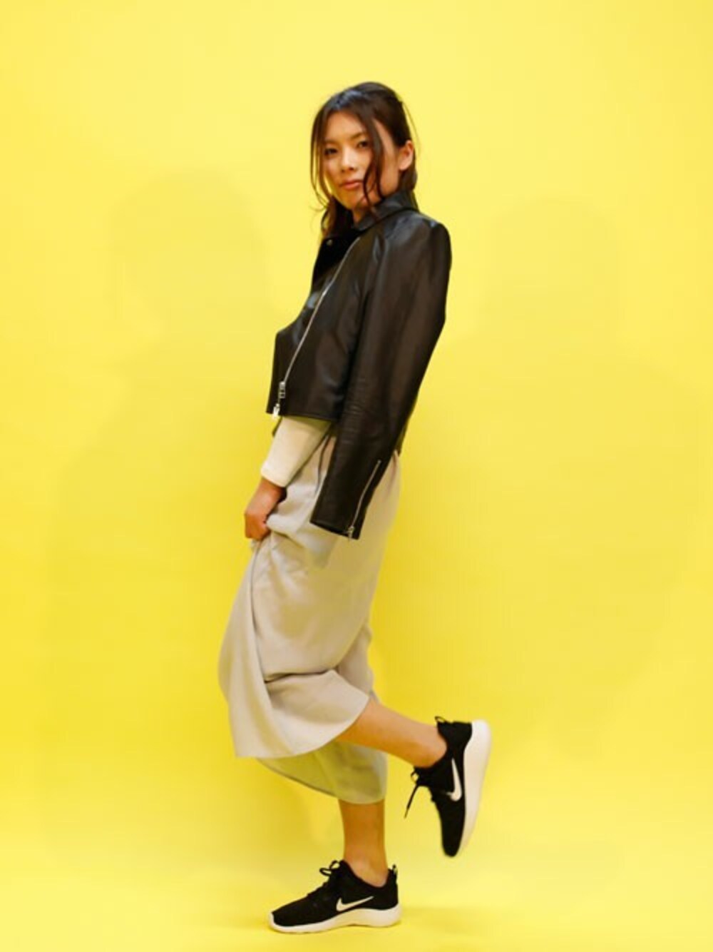 春らしい淡い色のトップスとガウチョパンツを黒のレザージャケットとシューズで引き締めて。 軽量で優れた通気性を発揮してくれるナイキのシューズは履き心地抜群です。 また合わせやすいデザインと色も魅力です。