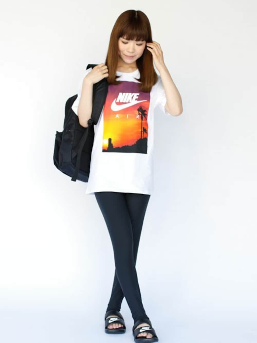 鮮やかなフォトプリントが目を引くNikeのTシャツにレギンスを合わせたカジュアルコーデ。トップスの裾が長めでヒップも隠れるので流行のレギンスコーデも気にせず出来ちゃいます。 足元は大人気のベナッシデュオを合わせて。
