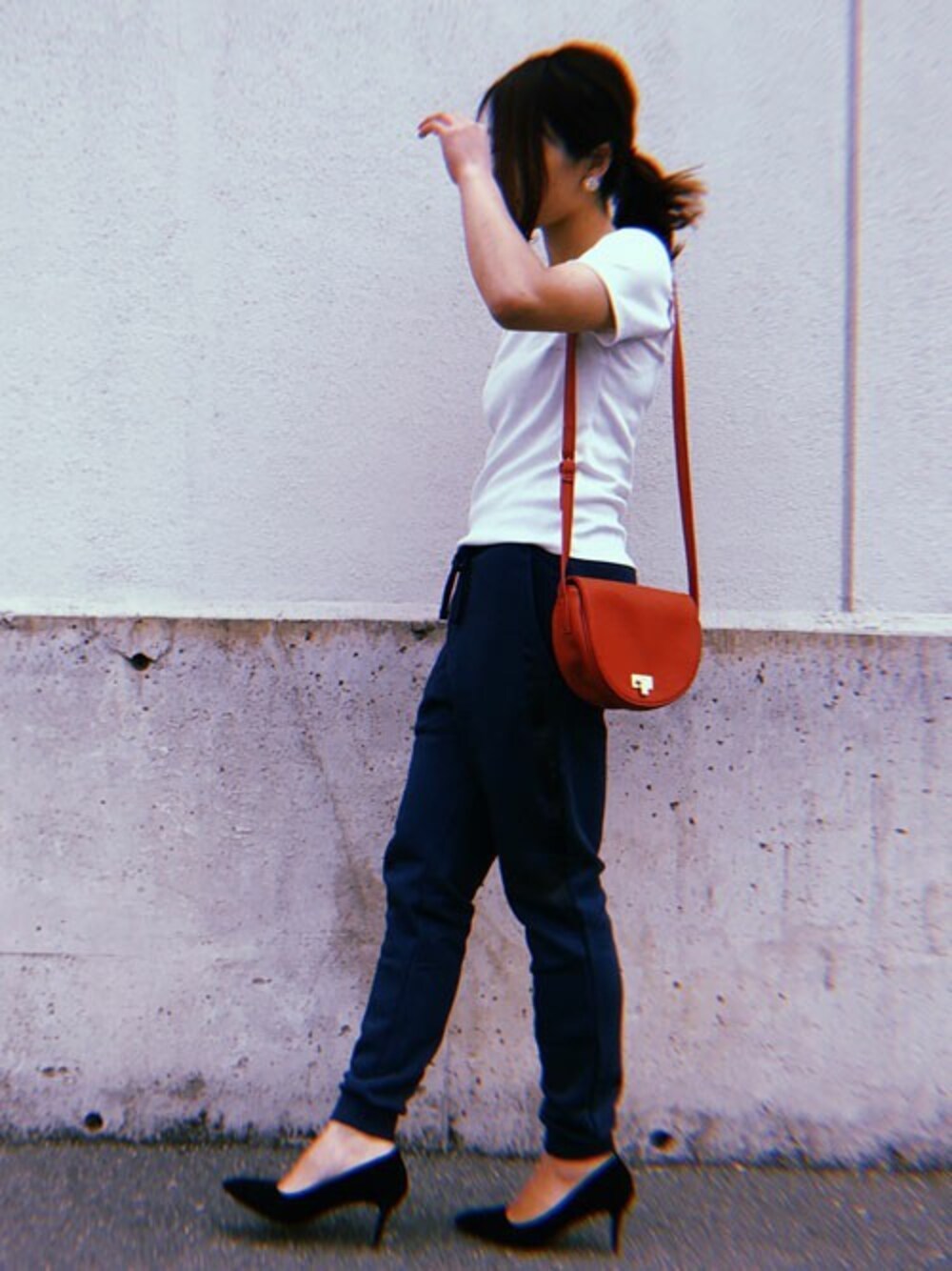 楽チン綺麗めスタイル。 スウッシュがポイントのパンツは、フリース素材で柔らかく快適な履き心地です。 パンツがゆったりしているので、コンパクトなトップスとヒールで引き締めて。