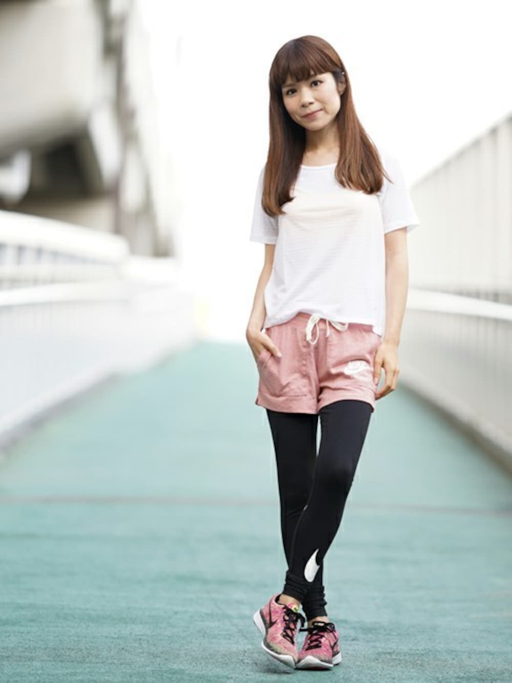 レギンスにショートパンツを合わせたレイヤードスタイル。 ランニング中もさらりと涼しく快適な着心地のTシャツで快適に。