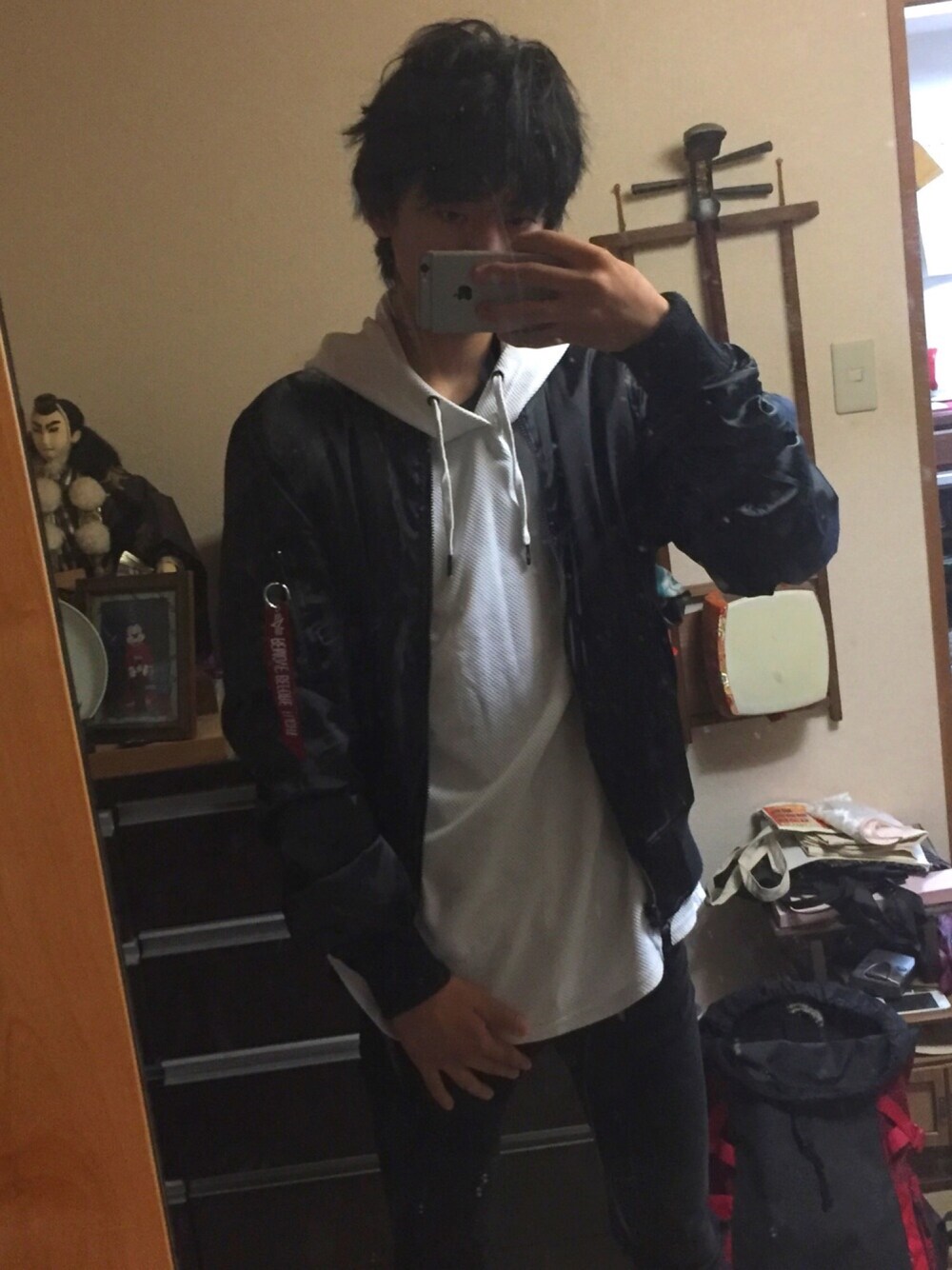 MA-1ジャケットコーデやってみました! Alpha のタグが目立ってカッコいいよね! 黒のMA-1だから白のパーカーが合うと思いました!寒いしパーカーがちょうどいい笑 本当にMA-1は今年大活躍やろうな!