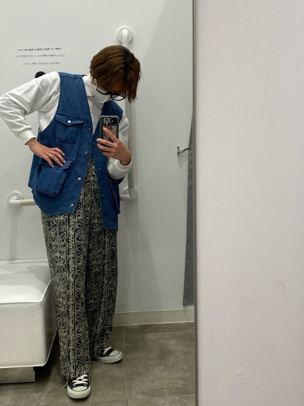 大工の休日コーデという名の銀行員の休日です お気に入りの柄パン履ける時期が来たな~。昨日お迎えしたデニムのベストかわいすぎるんよ🤍 gu様の試着室で撮らせてもらいました🥵(しっかり黒のサテンテーパードパンツお買い上げしました)