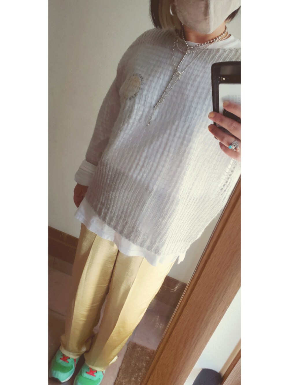 こんにちは 白カットソー➕グレーメッシュニット 🟡と🟢がいい 春と自覚できるコーデ