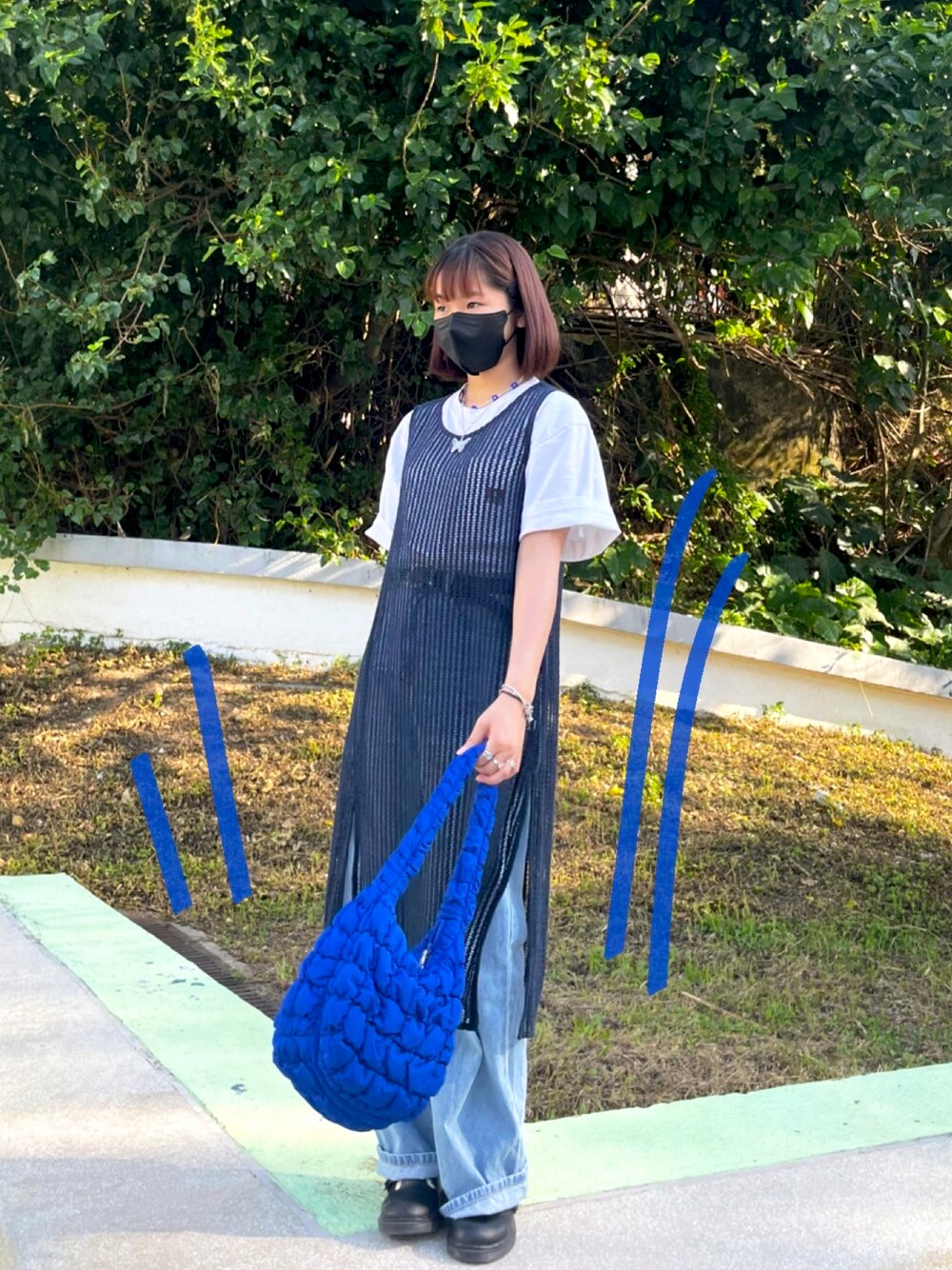 ブルー系のハンドバッグ、ホワイト系のシャツ/ブラウスを着用したレディースの春コーディネートの1枚目の写真