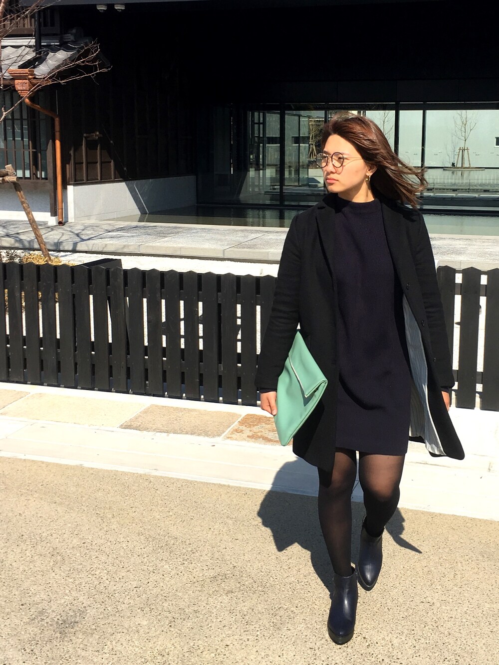 ブルー系のワンピースを着用したレディースの冬コーディネートの1枚目の写真