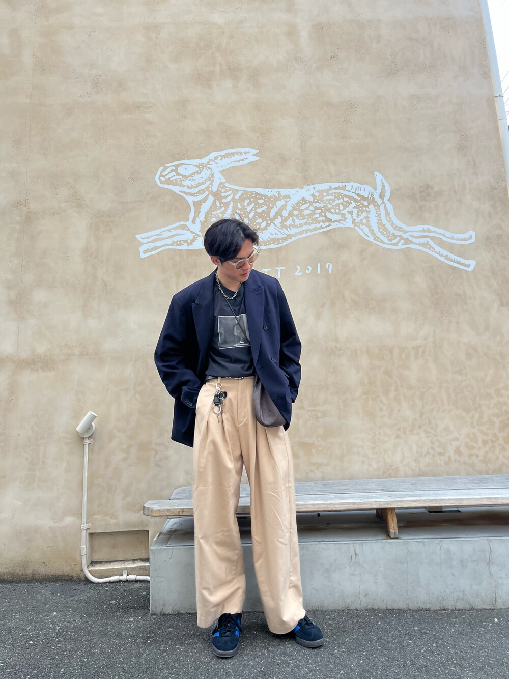 Iラインシルエットを意識 ゆったりとしたシルエットでゆとりのあるジャケットとワイドスラックスで若々しい印象がありつつも大人っぽい印象に😎 -Instagram- @ryoji0709