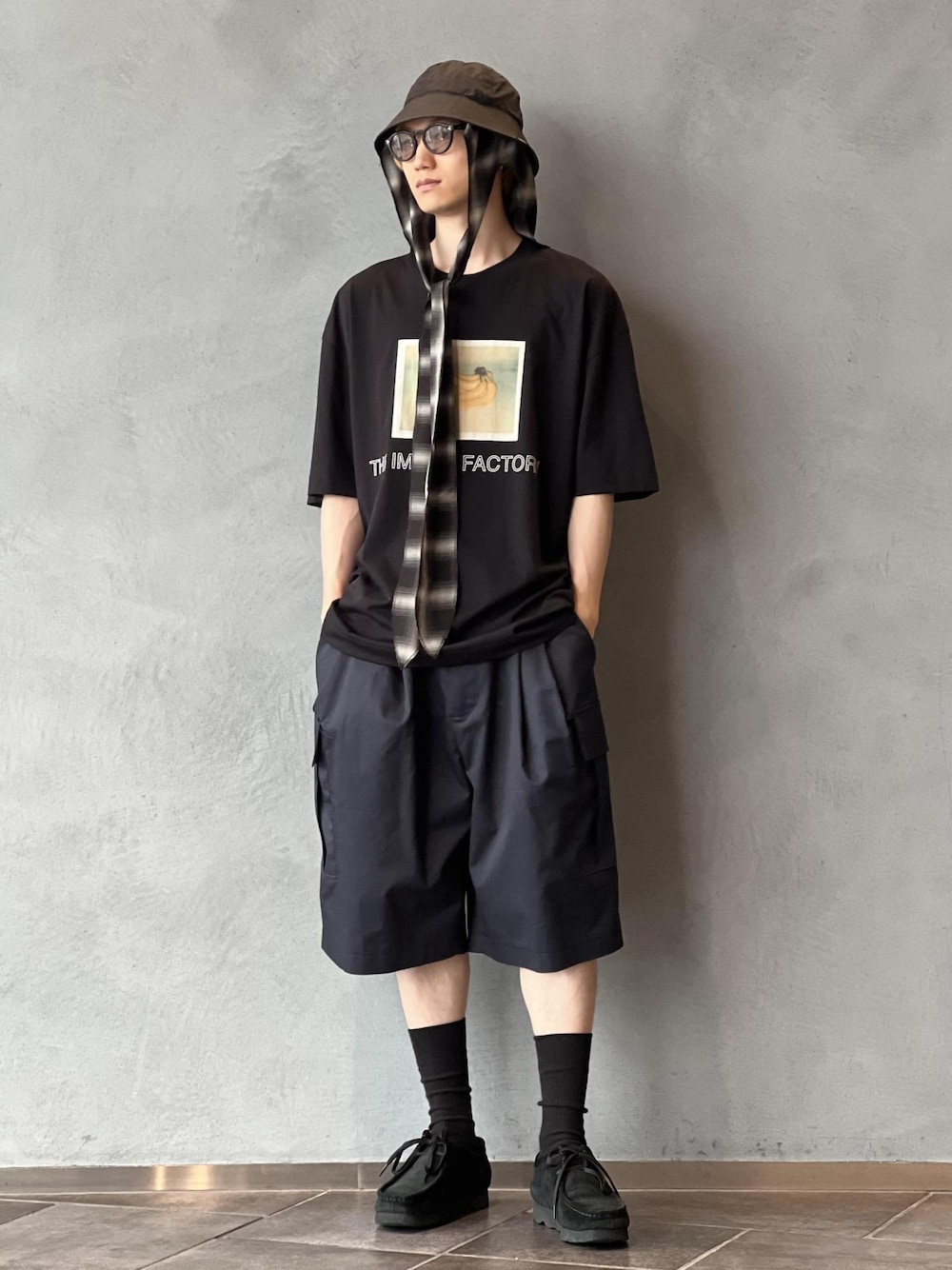 Tシャツにショーツのみのワンツースタイルなら 帽子や眼鏡、靴下等… 小物をいつもより増やしてみても良いかもしれません。 SOLARIS&Co. "LIMONTA TWILL BOWLER BUCKET HAT" ¥17,600(tax in) "OMBRE RAYON SCALF" ¥12,100(tax in)