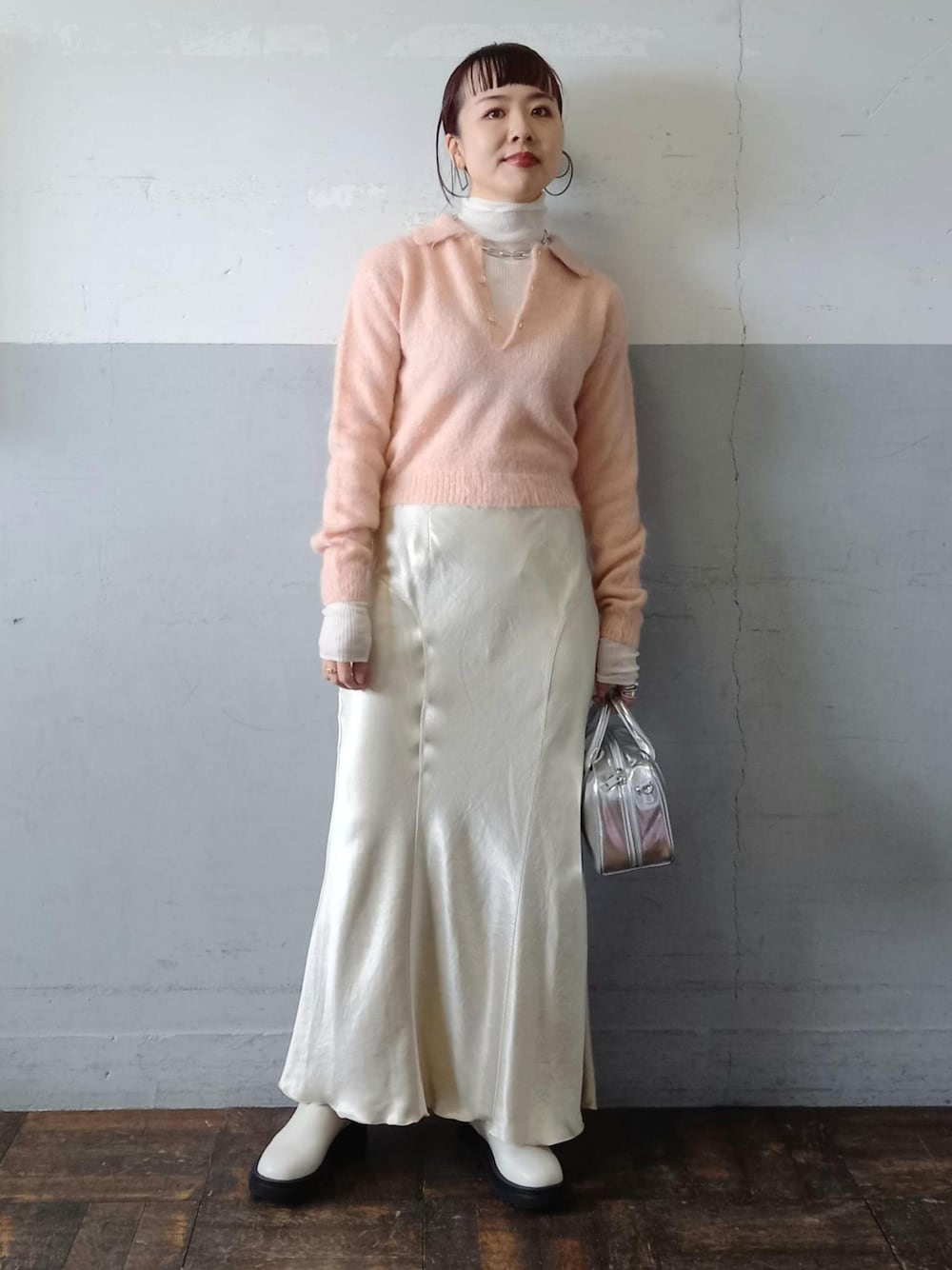 こんにちは!東原です。 オールシーズンお召しいただける汎用性の高い“サテンスカート”。サテンスカートって本当に使えます☺️ 艶っとした素材感がコーディネートの適度な抜け感を作ってくれますし、華やかさもプラス◎ 特に冬のコーディネートは素材的にも重く見えがちなので、抜け感は大切✨ しかもこちらのスカートはフロントの切り替えのラインが、 スッキリと見せてくれるのも嬉しいポイントです! スウェットやボリュームのあるトップス等とのバランスも好相性ですよ◎ 今回は冬のお出かけをイメージして、 明るいカラーで合わせてみました! 【AURALEE/オーラリー】のふわふわモヘヤニットとの素材の組み合わせが冬の鉄板コーデ☺️ 是非お試しになられてみてください⭐