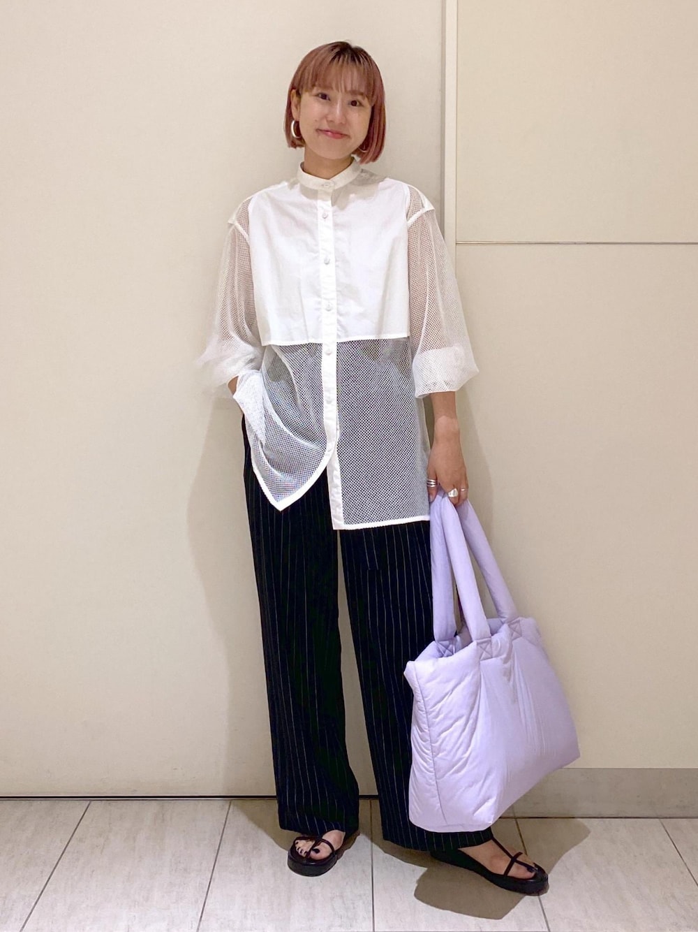 こんにちは! いつもご覧頂きありがとうございます^^ ルクア大阪の久保田です。 もう既にセールになっているアイテムからご紹介です! 柔らかくとろみ感のあるワイドパンツはフリーサイズでし体型を選ばずに着用頂けます! 共布で出来ているベルトでウエストマークして頂ければスタイルアップにもなって◎ 今日はメッシュシャツと合わせてスタイリングしてみました。 トレンドのメッシュ素材はキレイめなアイテムに合わせてもカジュアルすぎずに、大人っぽく仕上げてくれるので、1つあるととても便利ですよ^^ モノトーンな色合わせに少しカチッとした印象なので、 サンダルとカラーのバッグでアクセントを付けてみました! 参考になれば幸いです…! 店頭でお待ちしております(*^^*) 久保田 ※記載のないものは私物です。