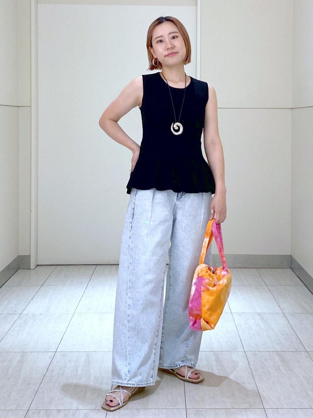 いつもご覧いただきありがとうございます(*^^*) ルクア大阪の久保田です。 大人気のディープライズワイドデニムを使ったスタイリングのご紹介です! ウォッシュ加工とワイド感が可愛いデニムなので、 より形が活きるようにシンプルなペプラムタンクトップと合わせてスタイリングしました。 ペプラム部分がコンパクトなので大人な印象。 ジャケットのインナーにレイヤードすれば お仕事服としても活躍しますよ☆ バッグで色味を添えたので、アクセサリーとサンダルはシンプルなものでまとめました! 是非チェックしてみてくださいね^^
