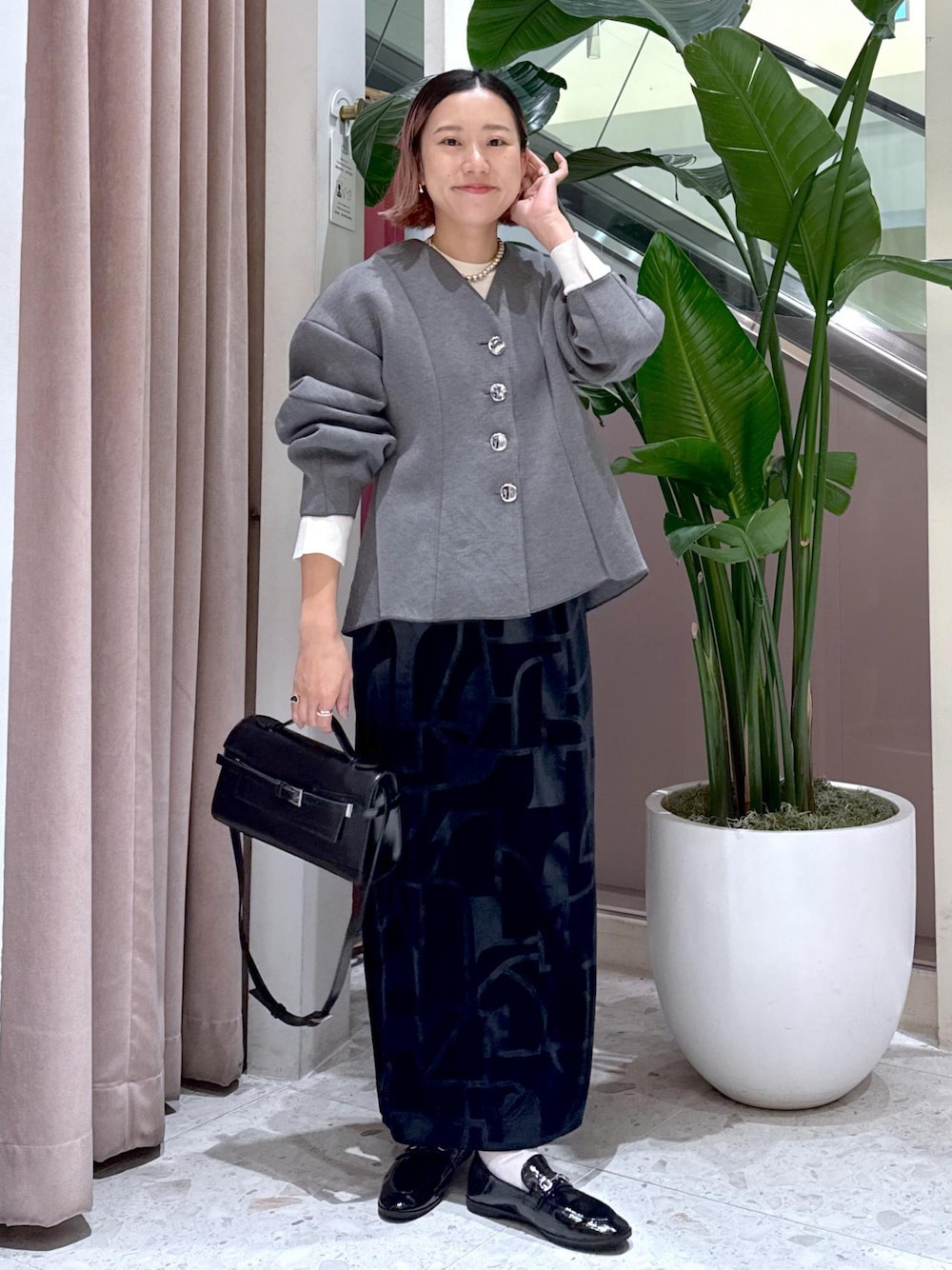 こんにちは! いつもご覧いただきありがとうございます^^ ルクア大阪の久保田です。 もうすぐ七五三の季節ですね! お着物を着られる方もいらっしゃると思いますが、 ワンパクなお子さまだと動きやすい服装を…と考える方も多いのではないでしょうか^^ 我が家がそうです……笑 暑さも残る11月なので、人気のペプラムカーディガンを使って 動きやすさのある七五三ママコーデを組んでみました! ペプラムシルエットが女性らしく、ウエストやヒップ回りをカバーしてくれるので、リーンシルエットのスカートを合わせました。 ベロア素材にエンボス加工がされていて、動くと模様の綺麗さが際立ちます! 伸縮性あるので、動きやすさも◎。 神社の砂利道のことも考えて、シューズはフラットにするのがベストです。 子どもたちより目立たずに、でもきちんと感とオシャレも忘れたくない方にオススメです。 日常使いやお仕事にも使えるアイテム達なので、着回し力もありますよ! 是非チェックしてみてくださいね!
