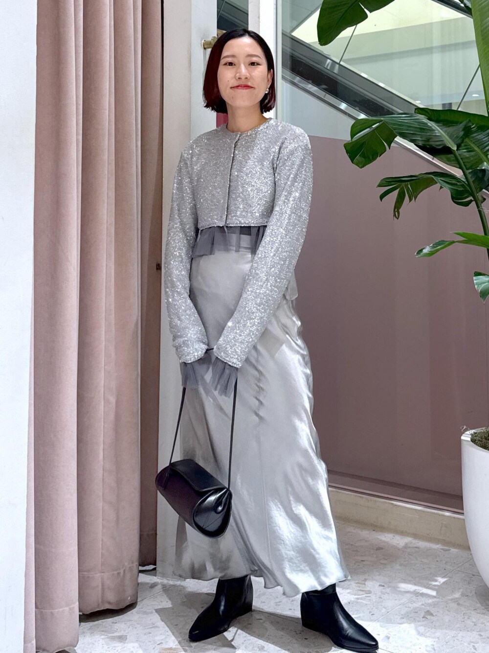 こんにちは! いつもご覧いただきありがとうございます^^ ルクア大阪の久保田です。 忘年会コーデ第2弾です! 夜の忘年会や会社での忘年会の時は 少しキレイめスタイルで。 夜のイルミネーションに負けない、でも派手になりすぎないように キラキラトップスを使ったワントーンでコーデです。 小物をブラックにしてキュッと締めてメリハリをつけています! トップスは2WAYなので前後反対にしても着用できますよ! 是非チェックしてみてくださいね!