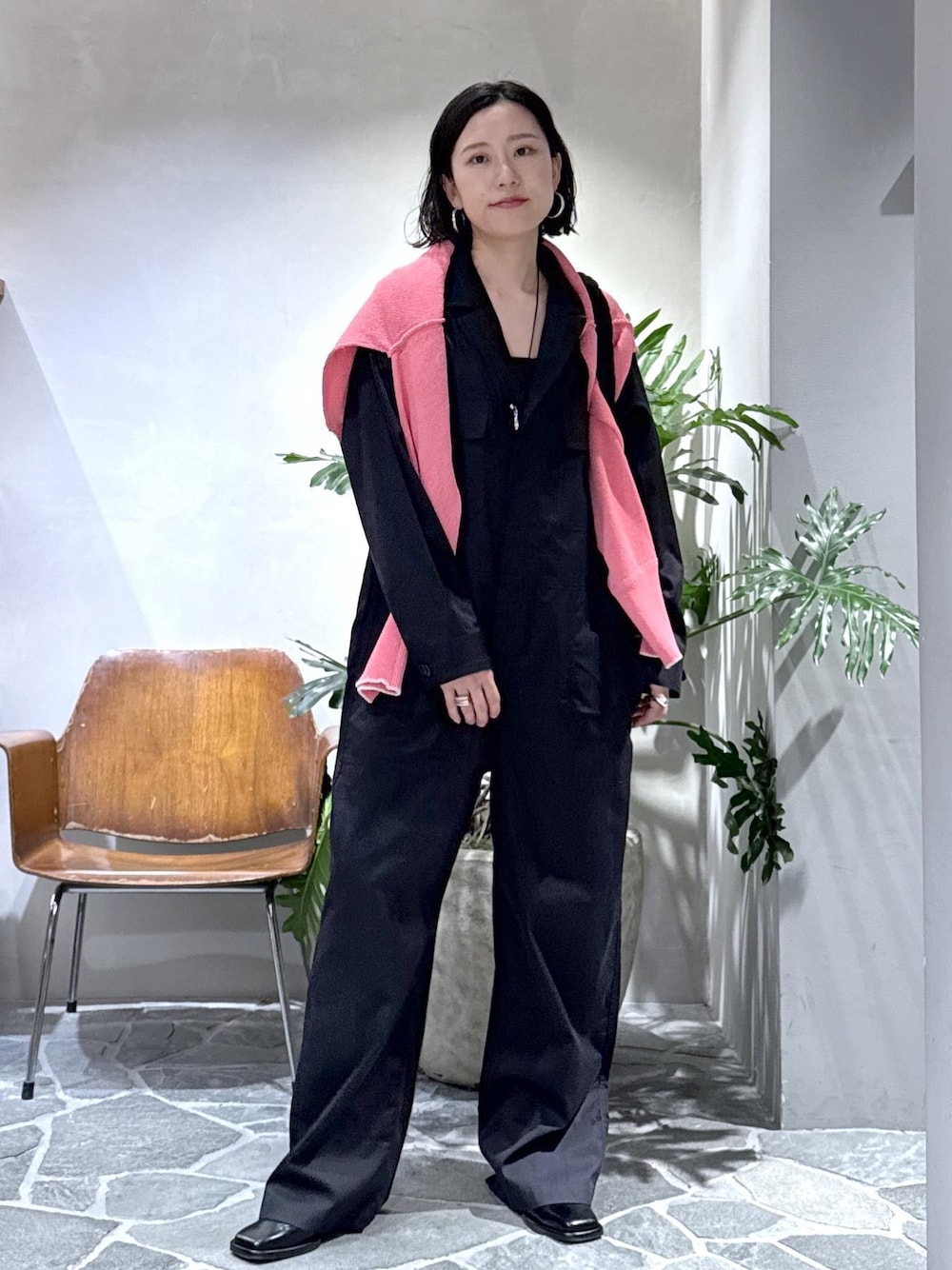 こんにちは! いつもありがとうございます。 Le minorのオールインワンでスタイリングしました。 ゆったりしたラインなのでピンクのニットを差し色に目線を上に上げています。 ブラックのモード感にプラスすると女性らしさも出るので、是非試してみてくださいね!