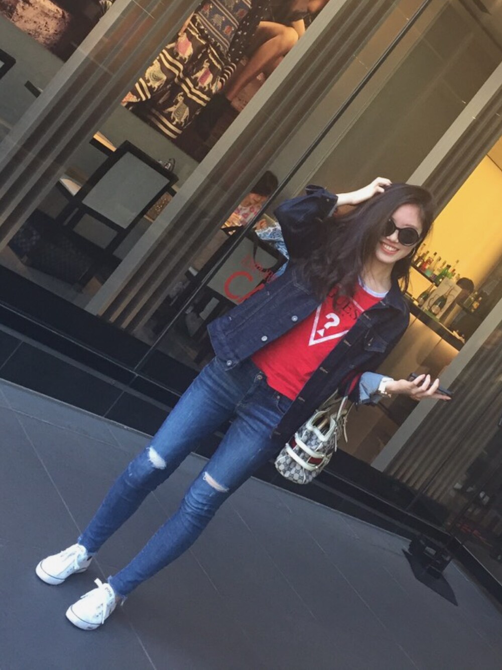 大好きなデニムオンデニムで赤の差し色❤️👖