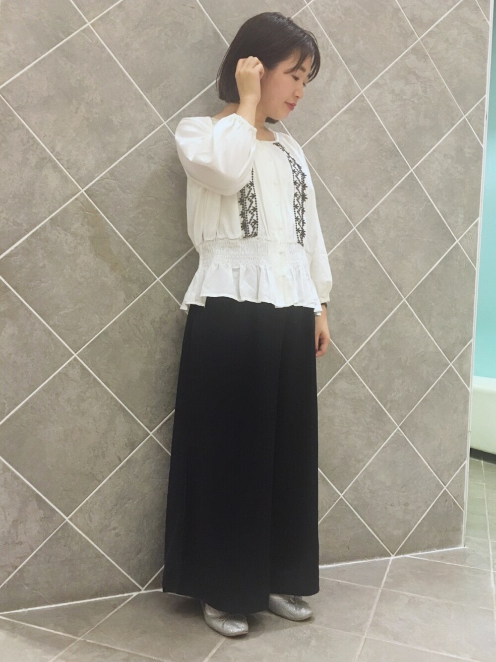いっつもカジュアルだけど 今日はちょぴっとキレイめ意識🙂 刺繍ブラウス可愛いです💕