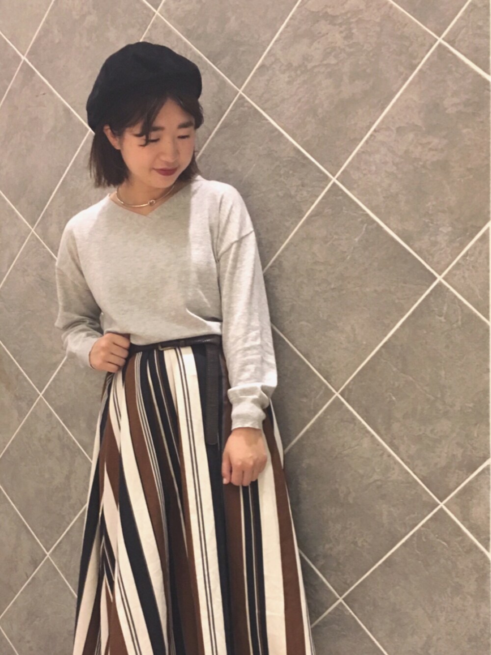 たまにはスカートをはいて きれいめコーデ♡ ストライプのスカートは お色が秋カラーだから 秋でも大丈夫だし、 縦ラインがきれいに見える! おすすめです♡