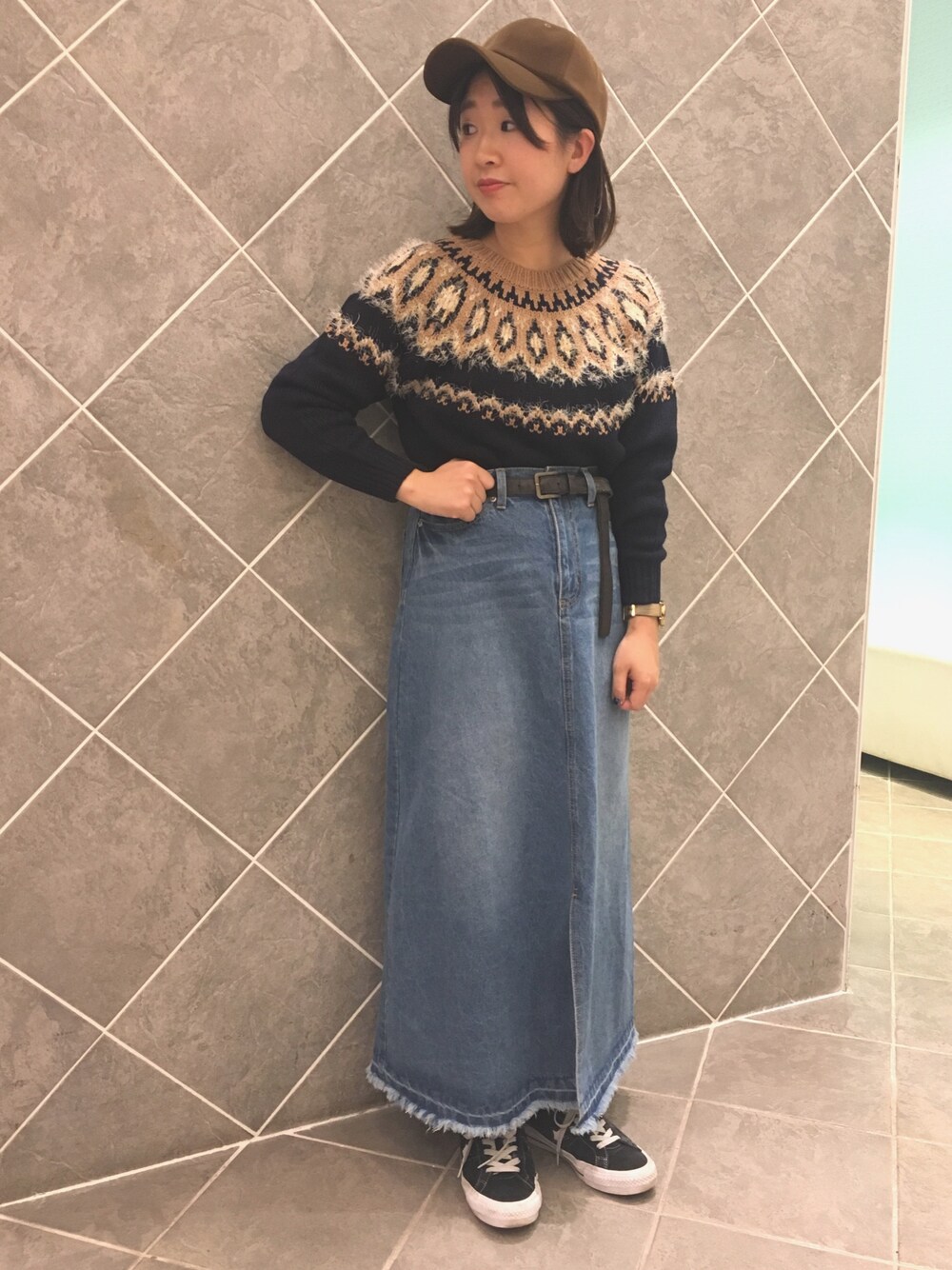 ネイビーのニットに 明るめカラーのデニムロングスカート バランスが◎ キャップとスニーカーで カジュアルに合わせました✌︎