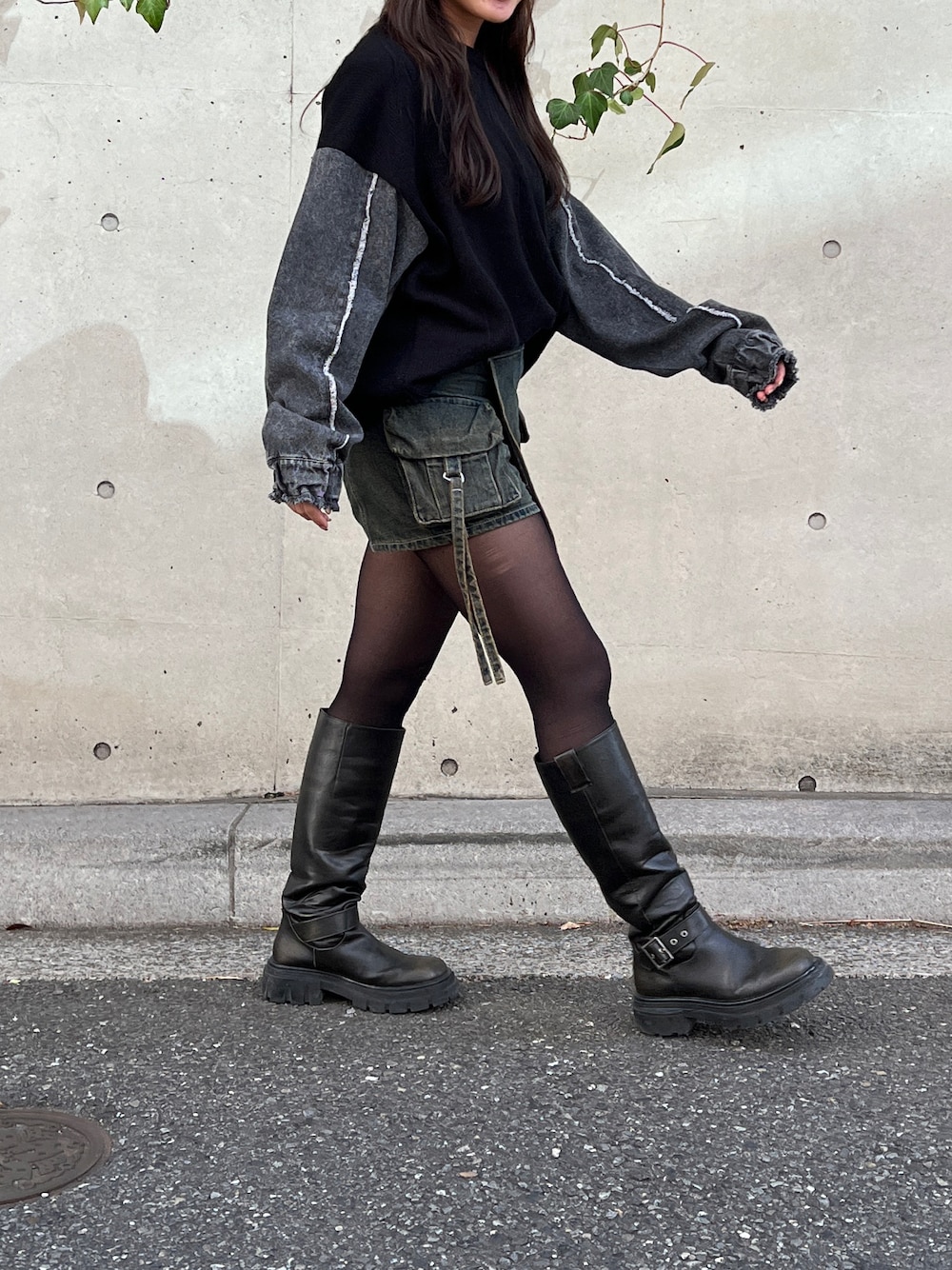 袖がデニムのニットで被らないカジュアルコーデに♪ ニットをメインに、ショートパンツとロングブーツでオールブラックコーデをしてみました◎