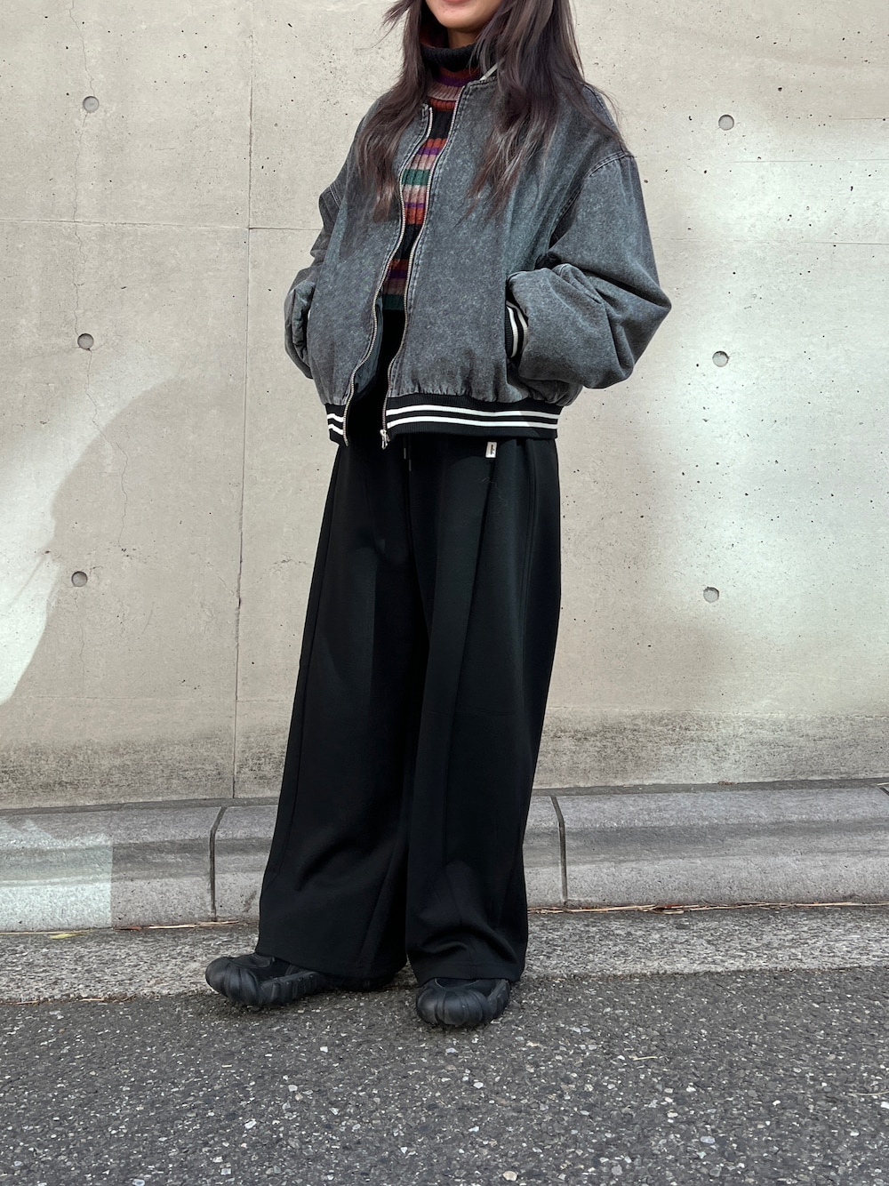 デニムスタジャンとスウェットでカジュアルブラックコーデにしてみました◎ スウェットは着心地良く、春も活躍する1本に! スタジャンは厚手ではないので春アウターにピッタリ!