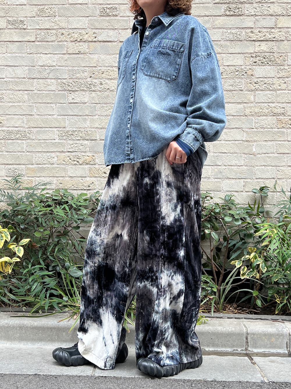 シンプルなデニムシャツなら、柄物のボトムと相性抜群です! 着回しの効くデニムシャツは1つ持っておくと◎