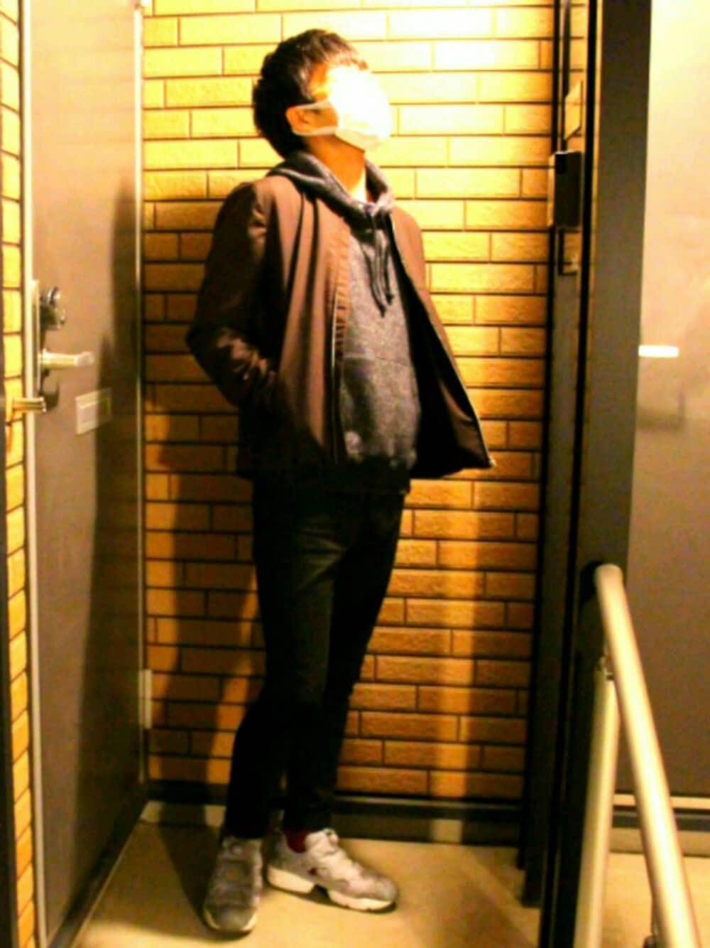 上下黒にHAREのボルドーのブルゾン 光強くて勝手に顔隠れてくれたから助かりました☺ どういうポーズしながらとればいいのか未だにわからないです 笑