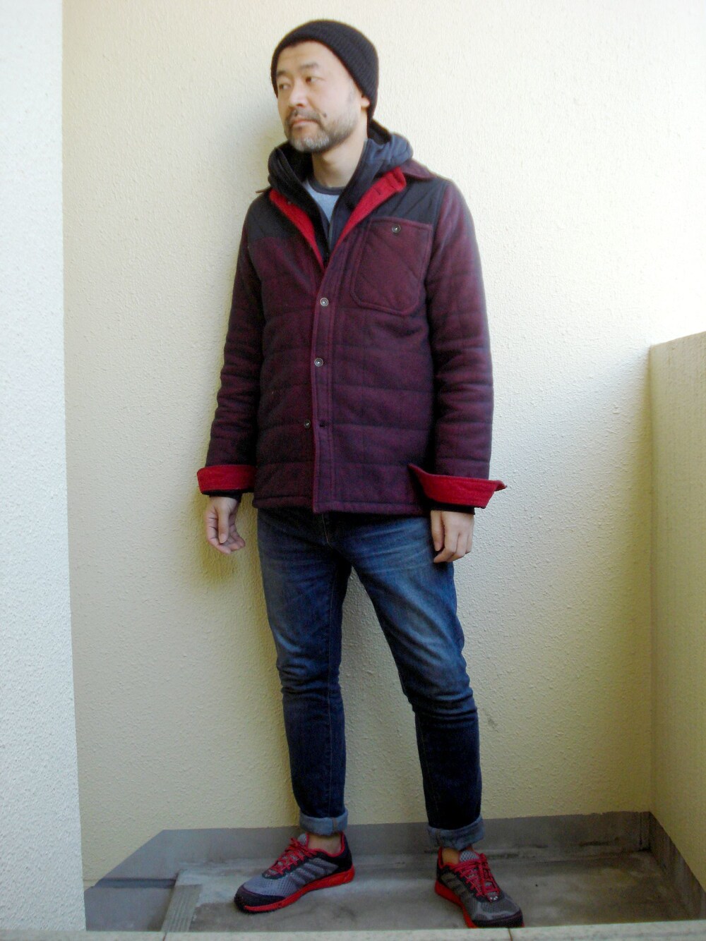 マックの三角いちごチョコパイを頼む時、若干小声になってしまう羞恥心をまだ捨てれません。 今回のコーデで久々にデニムを穿いてみたのですが、スキニーはどうしてもトップスの重ね着を大きく見せてしまうので、スニーカーを大きめにしてパンツ丈をロールアップしてバランスを調整しました。 中綿入りのシャツジャケットと撥水のパーカを重ねているので、見た目よりも防寒性が高いのです。