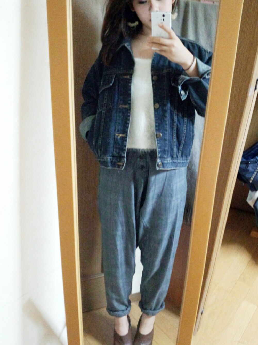 ブルー系のデニムジャケットを着用したレディースの秋コーディネートの1枚目の写真