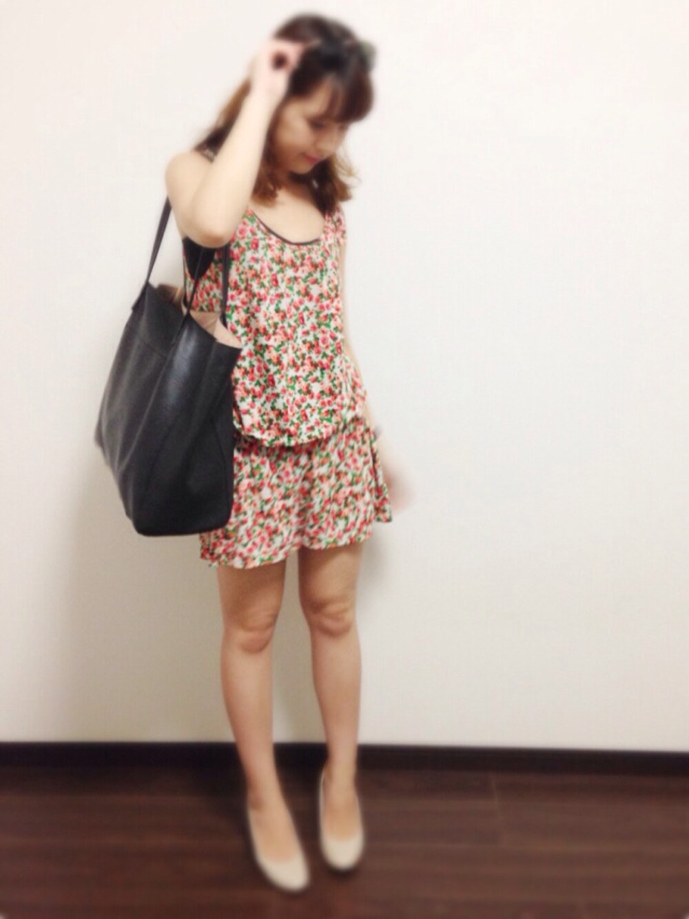 水着の上からサクッと着られるオールインワンの夏コーデ。明るいトーンの小花柄で夏らしさアップ。