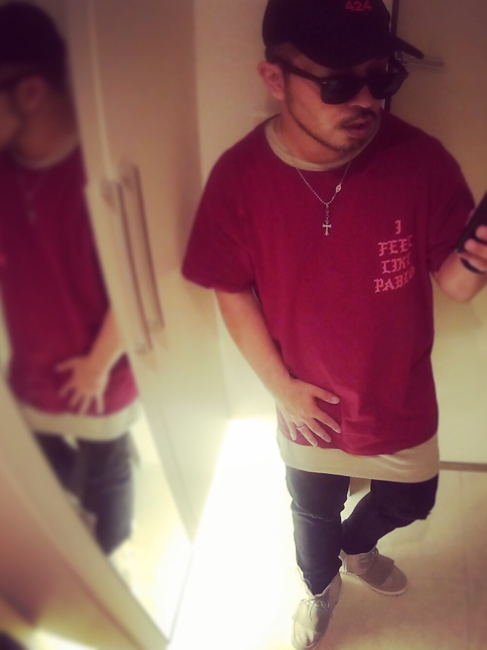 上からだと細く見えるけど足が短かく見えます。え?足が短いのは元からだって?😎😎😎 #お洒落デブ #feellikepablo #chromehearts #yeezyboost750 #adens #ootd #rayban