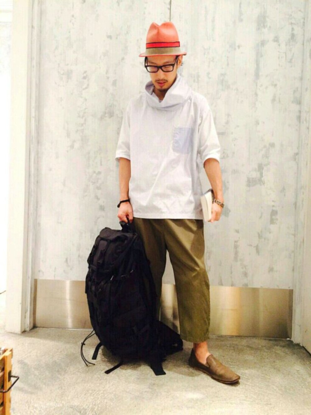 カーキのワイドパンツにストライプのハイネックシャツでバックパッカーコーデ♪ 赤いハットはもぅ~6年位愛用してるかな… かなりいい味出てきました♪