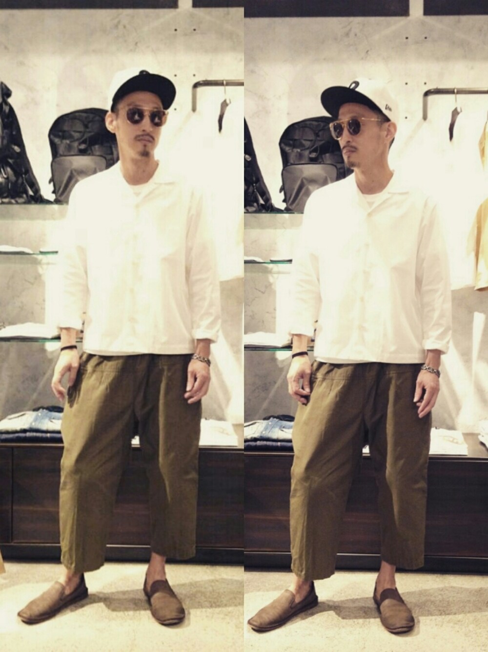 開襟シャツ♪ オープンカラーシャツ cap シャツを白でまとめてみました♪ 久しぶりのサングラス(笑) 今季らしくワイドパンツで合わせてみました♪ 白のcapいい感じ♪