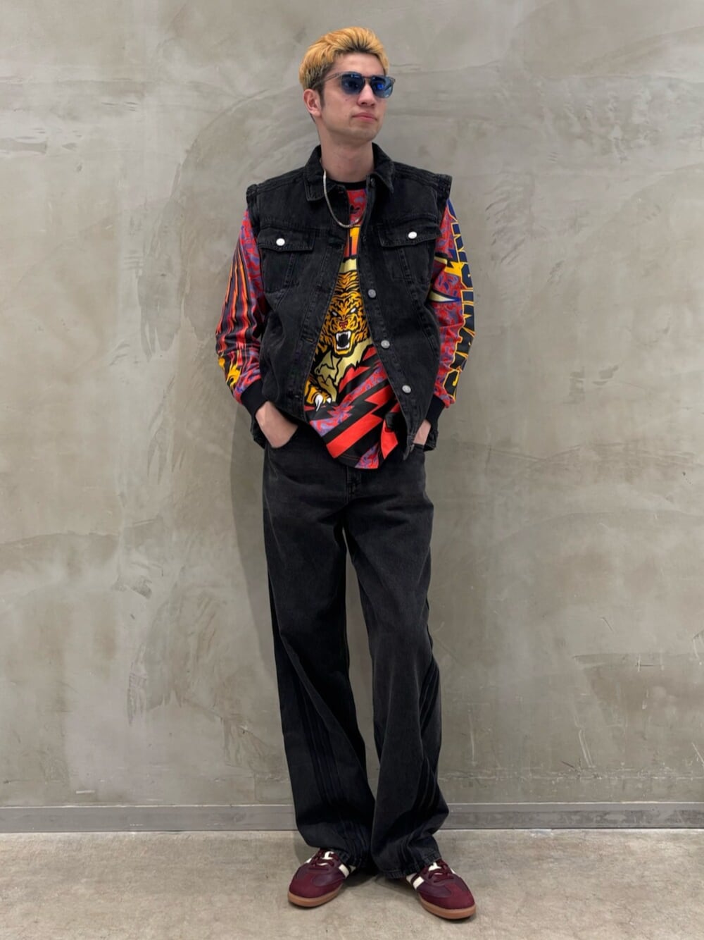 【TOPS】 サイズ感:オーバーサイズフィット 特徴・素材感:綿100%。着丈は短いが身幅が広くオーバーで着用でき袖も取り外しができるので2タイプの着方ができる。 【TEE】 サイズ感:オーバーサイズフィット 特徴・素材感:綿100%。インパクトなデザインに加え着丈がかなり長くオーバーサイズで着用できる。 【PANTS】 サイズ感:ルーズフィット 特徴・素材感:綿100%。ウォッシュ加工が付いており足元にかけてラインが入っており幅も広くオーバーで着用できるデニムパンツ。
