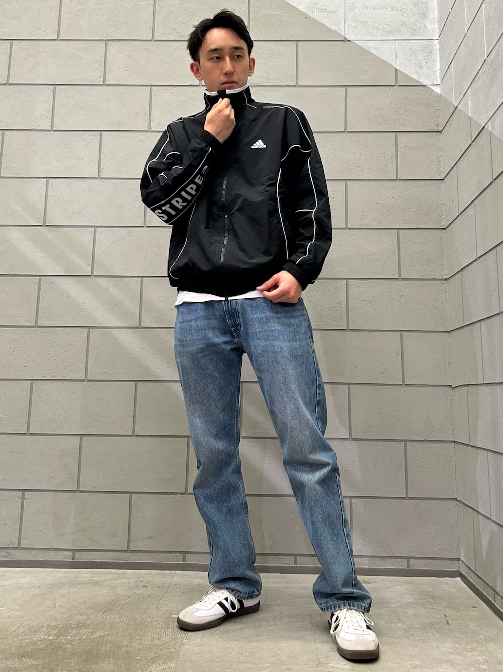 OS(アディダス ブランドコアストア 銀座)のナイロンジャケット「ワーディング ルーズフィット シワ加工 ナイロンウーブン 起毛トリコット 裏地付きジャケット(ジェンダーニュートラル) / アディダス adidas」を使ったコーディネート