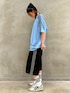【TEE】 サイズ感:ルーズ 特徴・サイズ感:薄手で柔らかく、軽くて肌触りの良い素材感。ポリエステル100%でサラッと着用可。全体的にルーズなシルエットで大きめ。 【PANTS】 サイズ感:ルーズ 特徴・サイズ感:長さは膝下まであり、大きめのシルエット。 ウエストは少し大きめだがベルトループ付きでベルト着用で調整可能。