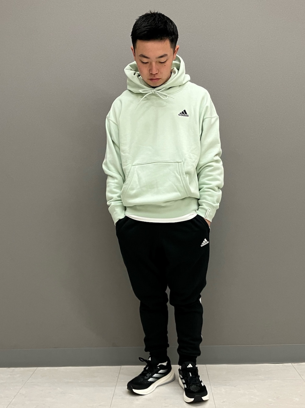 NT(アディダス ブランドコアストア 横浜ジョイナス)のパーカー「エッセンシャルズ プラス ルーズフィット スモールロゴ フレンチテリー プルオーバーパーカー / アディダス adidas」を使ったコーディネート