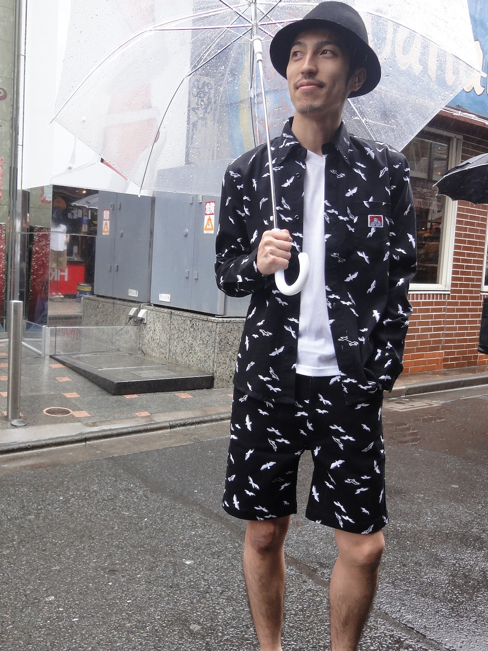 カモメ柄のセットアップスタイル。 雨の日は足元だけでも夏らしくショーツで!!