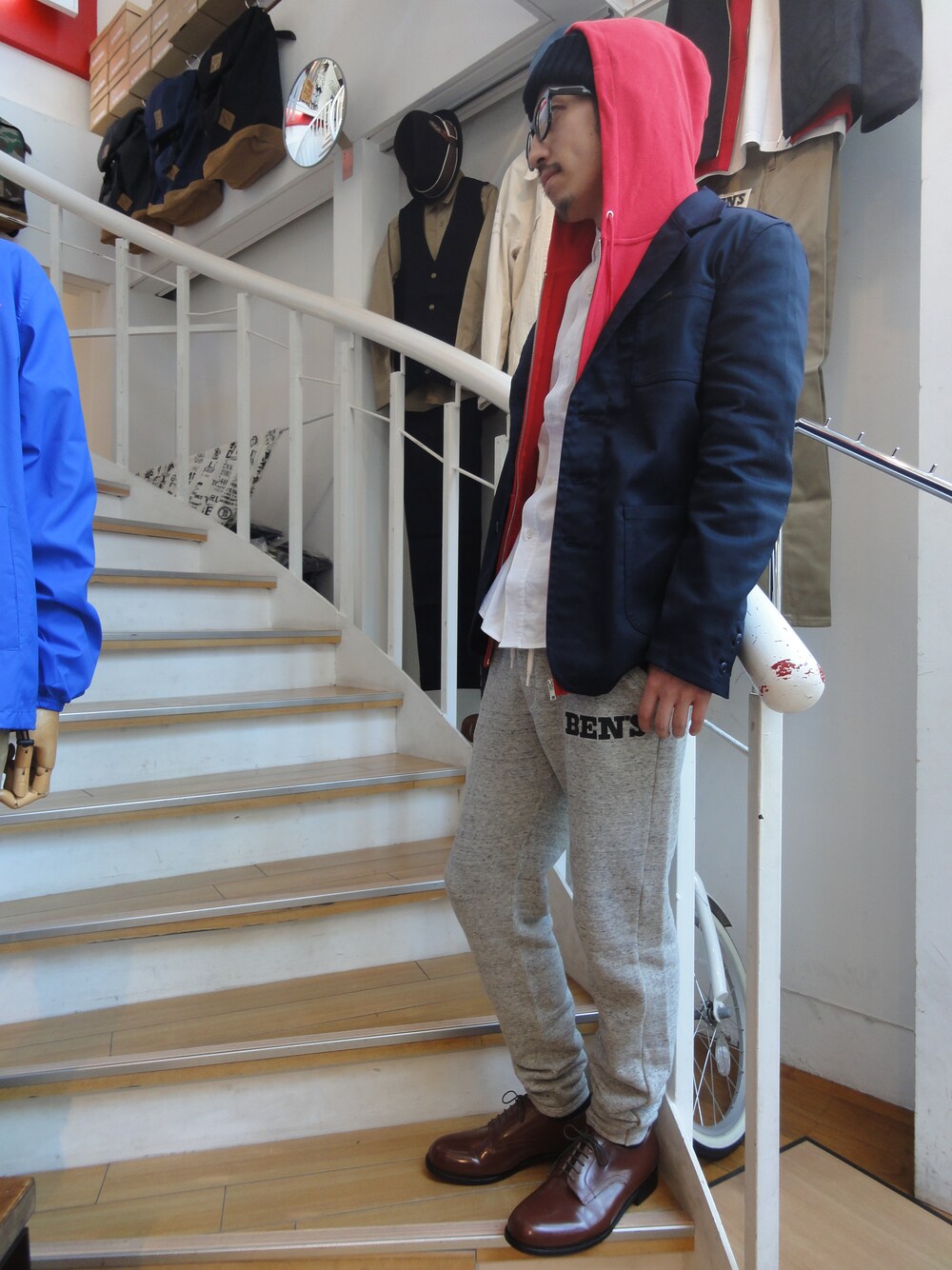 スウェットパンツのコーディネート。 シャツ×パーカー×ジャケットの王道重ね着がオススメポイント。 シューズをフォーマルにすることで、カジュアルになりすぎず、スウェットらしくなりすぎず、絶妙なバランスです!