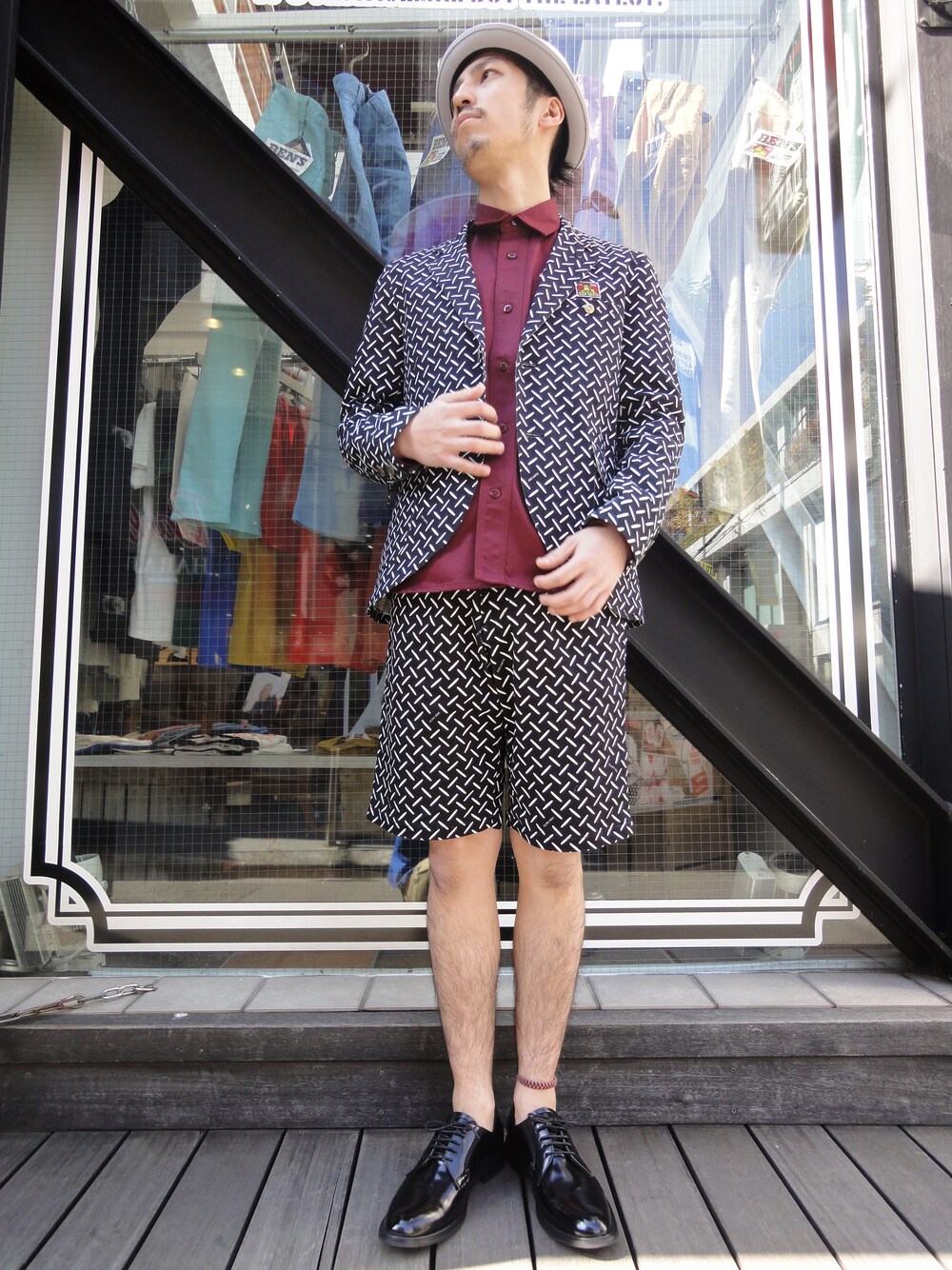 総柄ジャケット×ショーツのセットアップコーデ。 フォーマルな服装でお出かけ!・・・でもインパクトのある総柄は忘れずに!