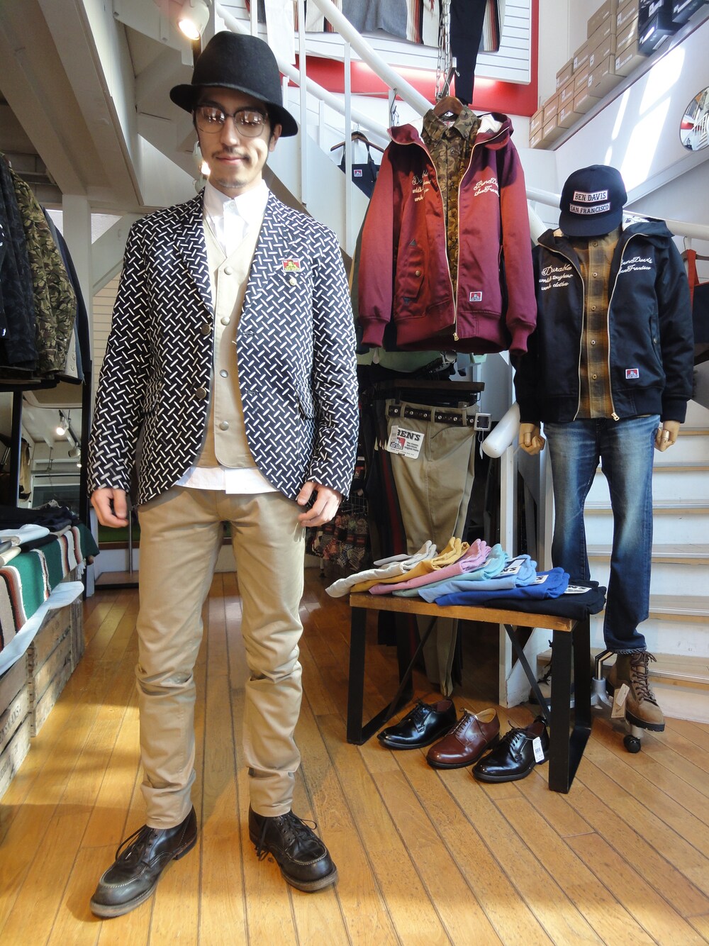 総柄ジャケットのコーディネート。 ボトムスはシンプルに無地パンツで合わせて大人なカジュアルスタイルに。 メガネは欠かせません!