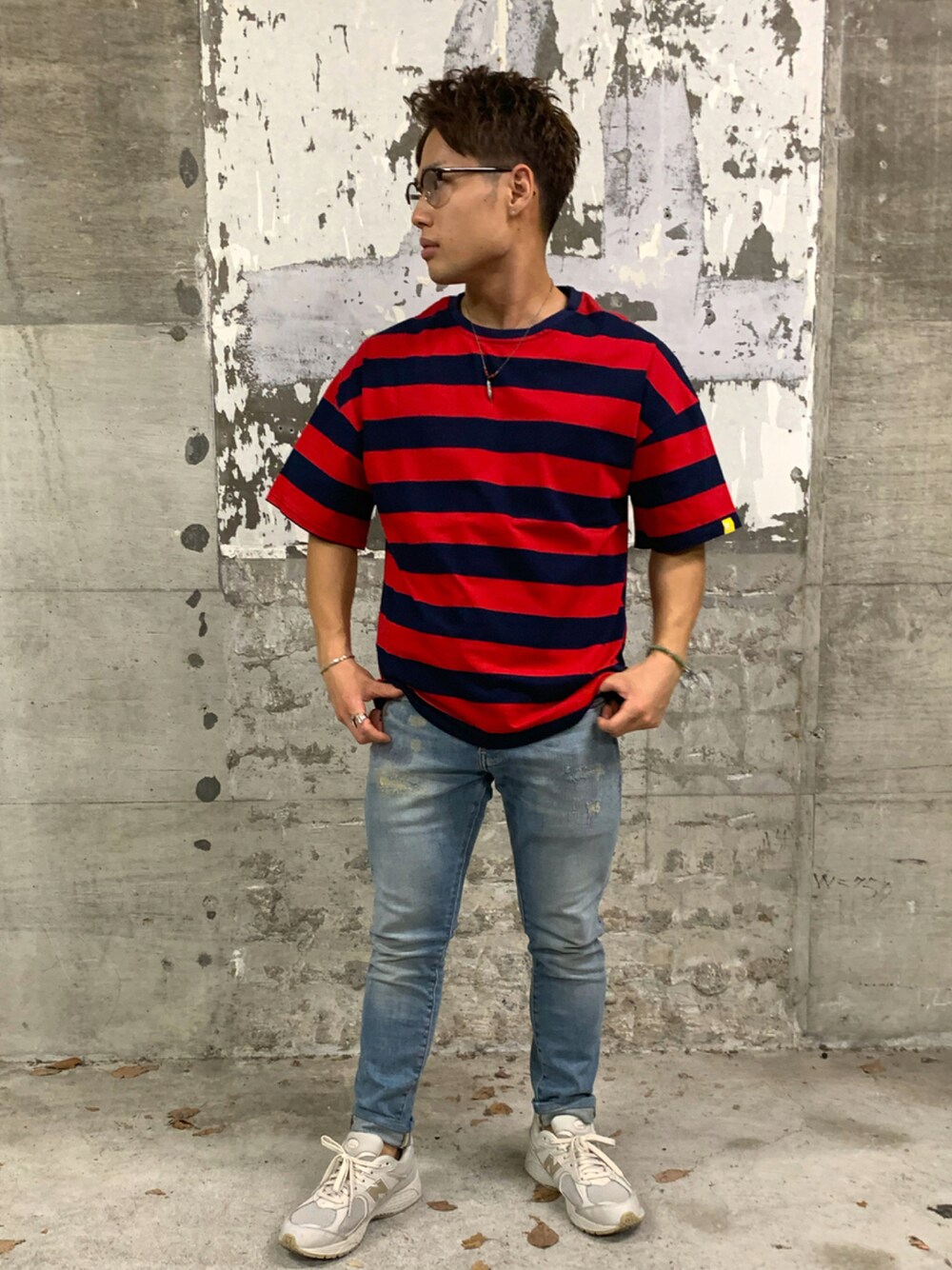 赤のボーダーtシャツとデニムコーデ デニムの色との相性がよくて全体的にまとまった色合いになっています👏 Instagram👉 armadillo_nunsense