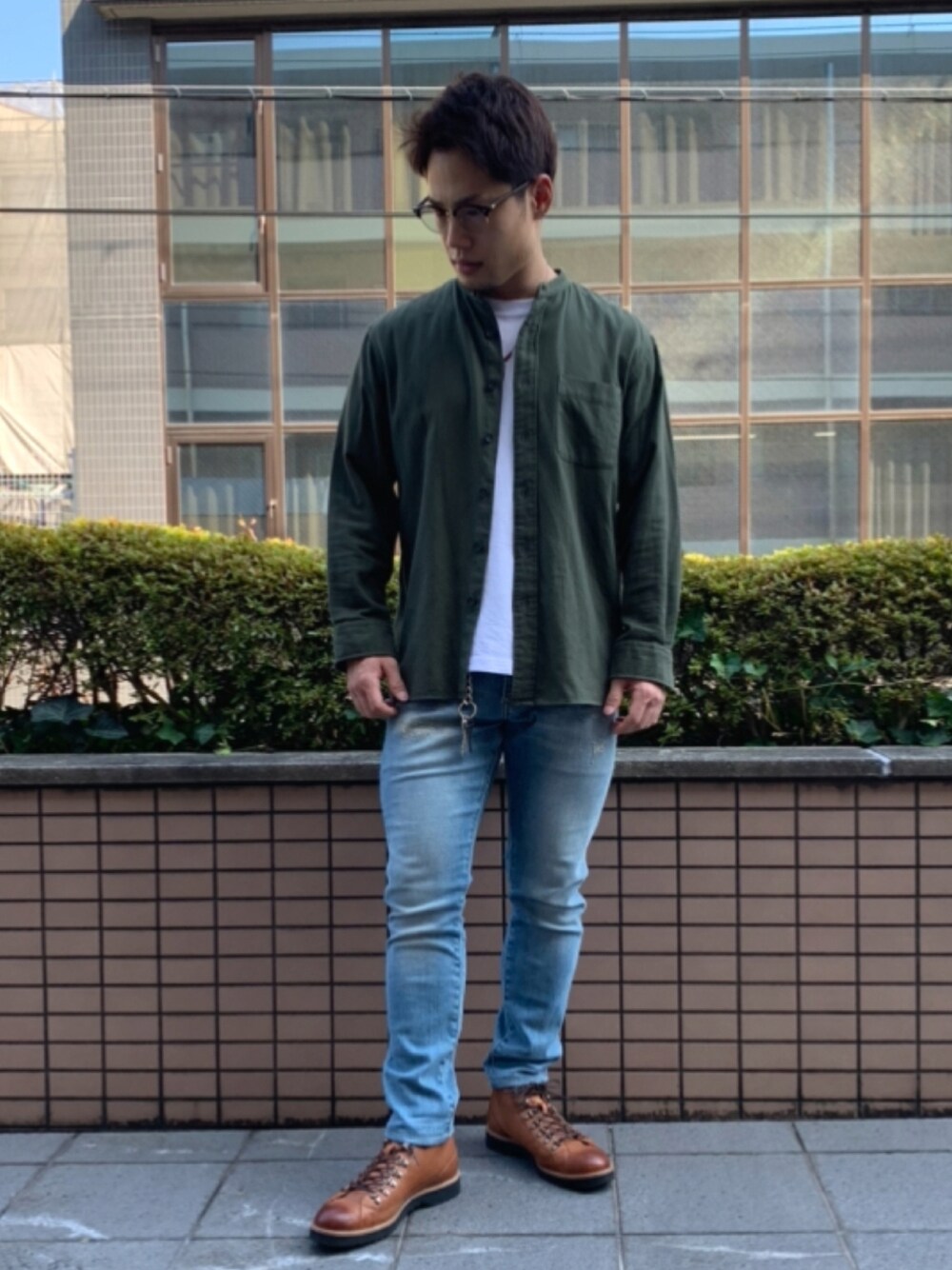 こんにちは🙌 シャツ×デニム×ブーツのコーデ UNIQLOのオリーブのシャツとデニムの相性が良い感じです!茶色のブーツもコーデにマッチしてます👏