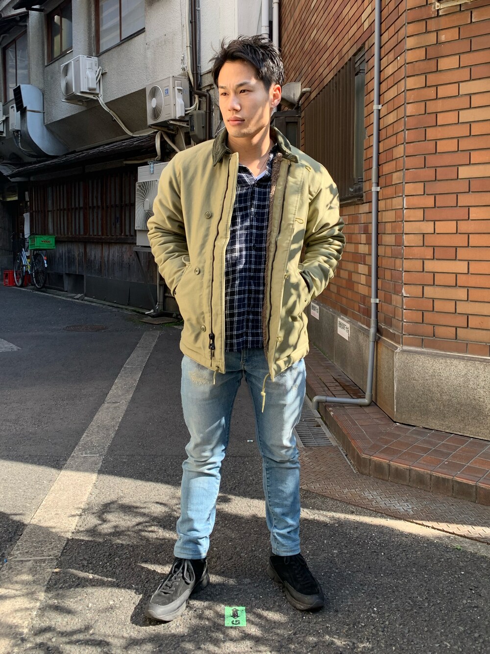 アウターはHoustonのDECK JACKET! 絶妙なカラーリングで、襟元がコーデュロイ生地になっていて男らしいコーデに仕上がってます! シャツはnano universeのノーカラーチェックシャツになります!