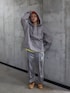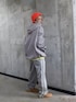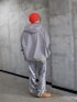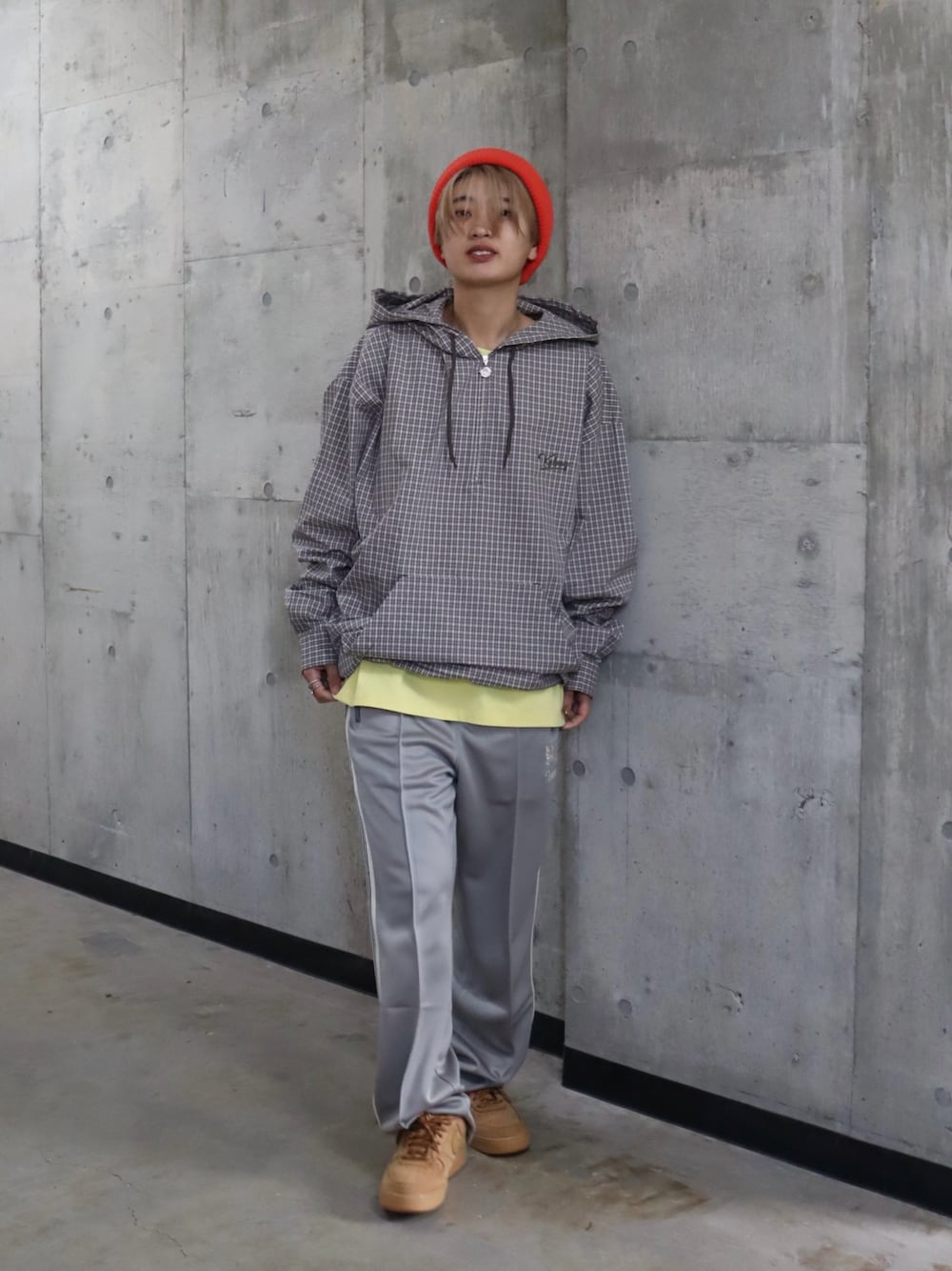 赤のビーニーが視線を引きつける差し色になっていて、シンプルな配色の中に遊び心を感じさせます。 全体はルーズシルエットで統一しつつ、スポーティーさと軽やかさを両立。